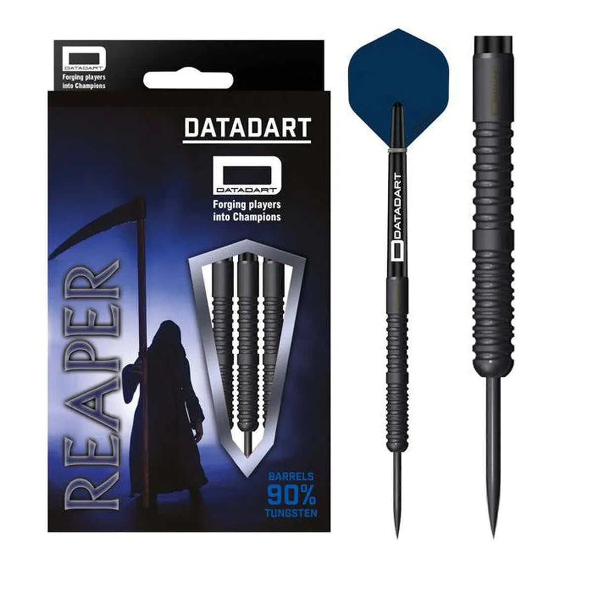 The NEW ‘REAPER’ range features a distinctive sleek black PVD coated barrel. The DataDart ‘Reaper’ darts are made from 90% tungsten with a black PVD coating featuring a slim ringed radial grip to the front of the barrel and a smooth wider Radial grip to the rear, sure to enhance your grip on the dart. 90% Tungsten Barrels, Black DataDart signature stems, one set of Matte Blue DataDart signature flights