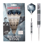 Unicorn Gary Anderson Silver Star 80% Tungsten Darts. Features: 80% Tungsten Nickel Alloy, Precision engineered barrels, Matched Weight Series - set of 3 barrels within 0.1g, Gripper Shafts.