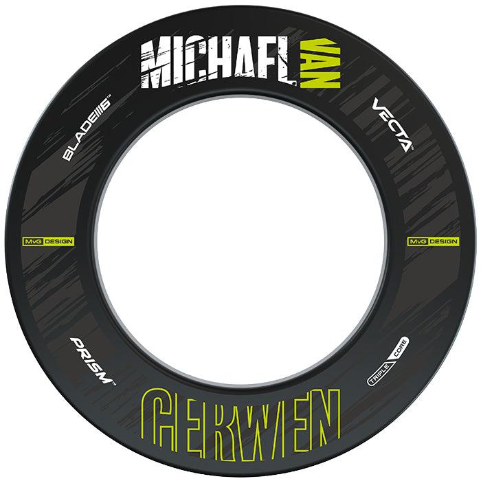 The Winmau Surround ( Available in various colours and designs) not only shields the wall behind the dartboard but also guards the tips of your darts. It fits perfectly with dartboards of all brands, and can be easily mounted by clamping it onto the board. The high-density material used to construct this surround ensures it's durable and will serve you for an extended period.
