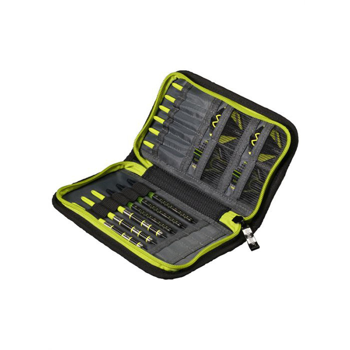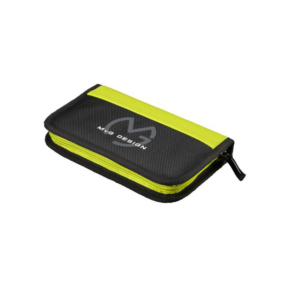 Winmau MvG Sport Edition Green and Black Wallet - Robust slimline single fold dart case. Holds 2 sets of darts with shafts, 11 compartments. Dimensions: 18cm x 10.7cm x 2.8cm.