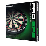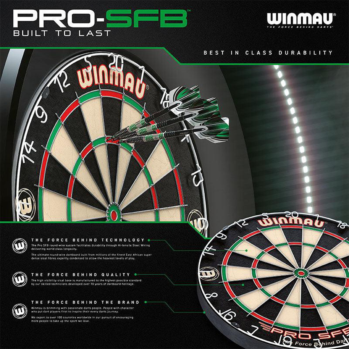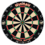 Winmau Pro SFB Dartboard - Round wire dartboard manufactured from the finest high tensile steel. Features staple-free bullseye and Cliple II Technology for reduced bounce outs. Consistent construction super-dense sisal base built to last. Anti-Glare number ring, game of darts booklet and checkout table.