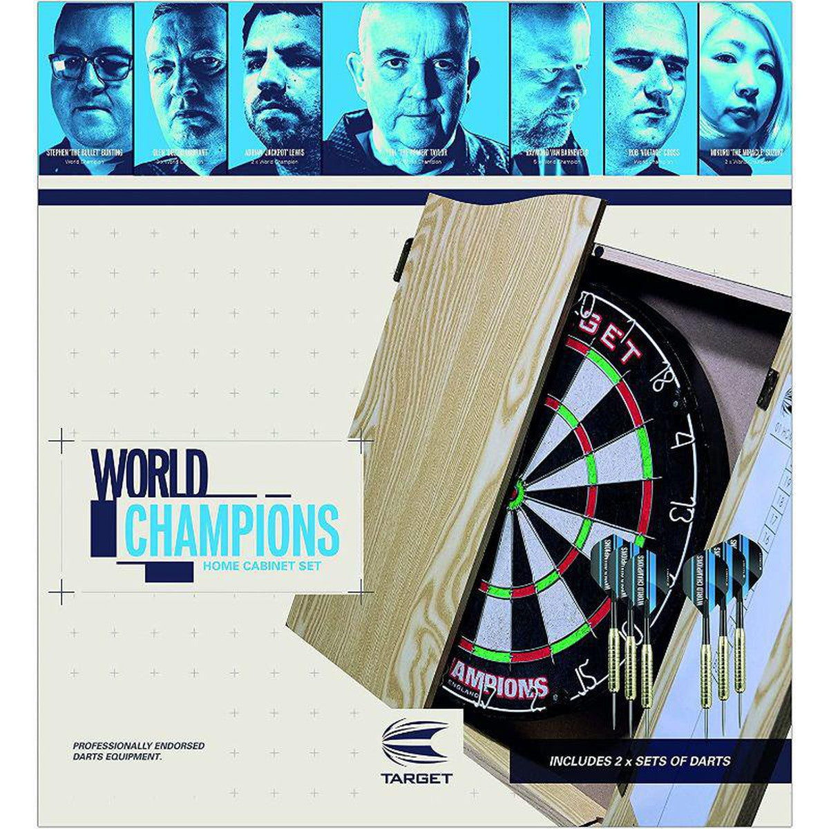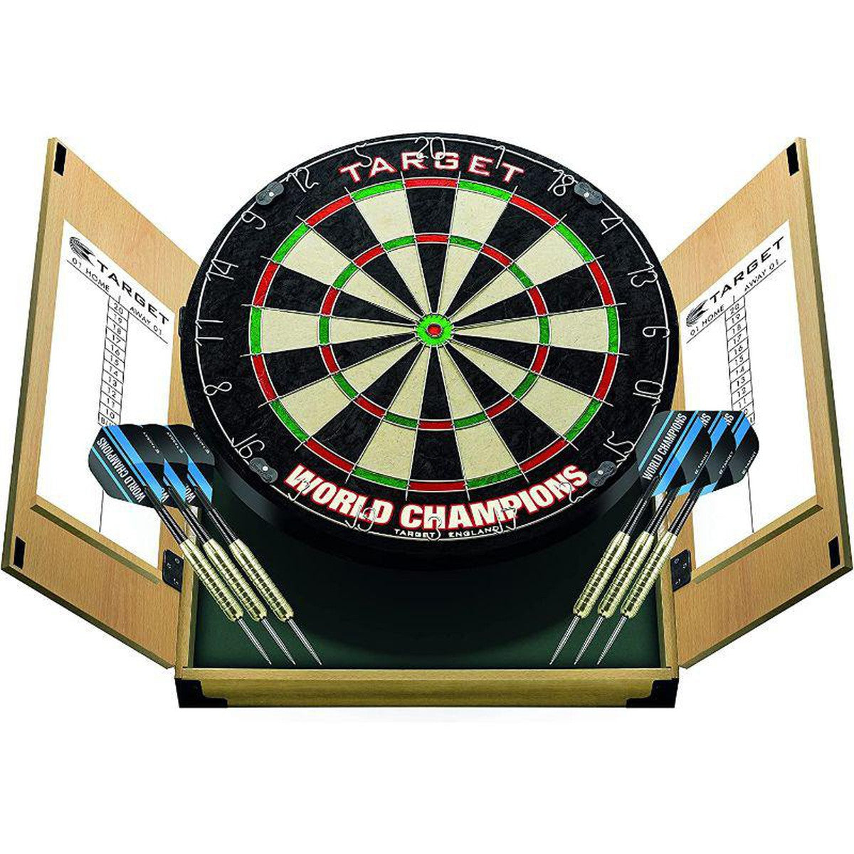 The World Champions cabinet set also comes with 2 sets of Brass Darts, whiteboard, whiteboard marker pen and an eraser.